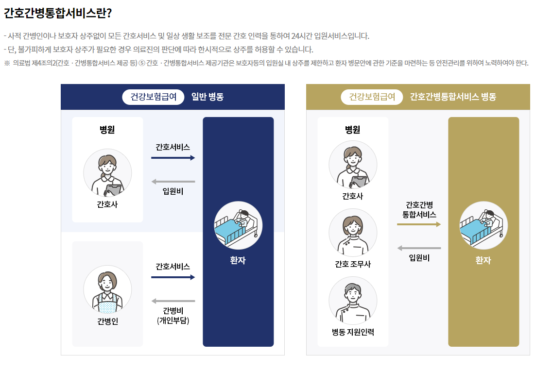 간호간병통합병동의 경우 수술 상담 시 간호간병통합병동 이용을 희망하신다고 말씀해주시면 됩니다. 그런데 제 경우 누락이 되었어서, 이후 원무과에서 입원 수속을 하실 때도 꼭 두 번 세 번 간호간병통합병동 이용을 희망한다고 여러번 되새겨주시면 더 좋을 것 같습니다. 하기 이미지는 강동경희대병원 간호간병통합서비스 안내 부분에서 잘라온 이미지입니다.