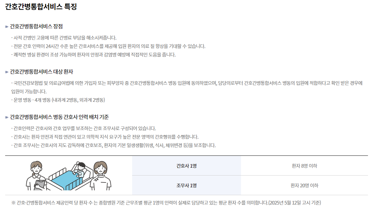 하기 홈페이지 안내 사항을 보면, 간호간병통합병동의 경우 조무사(간병인) 1인당 20명 이하, 간호사 1명당 8명 이하의 환자를 돌보도록 되어 있습니다.