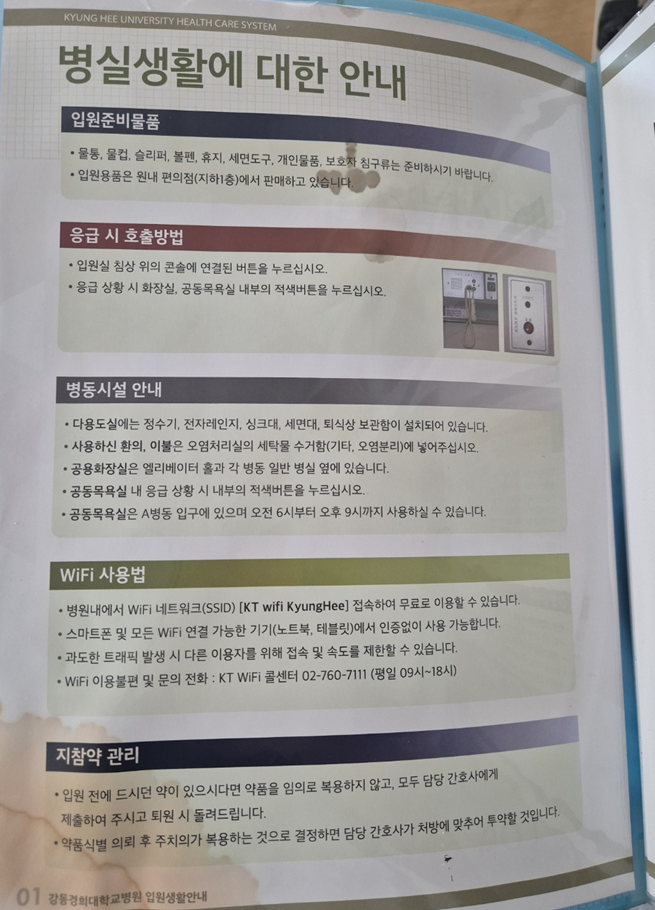 아래는 병원에서 주신 입원생활 안내문과 병동 출입을 위한 입원 환자용 팔찌입니다.