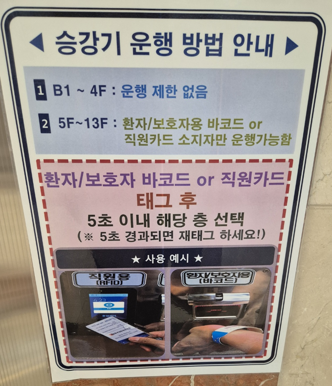 호텔이랑 비슷한 시스템입니다. 입원실에 진입하려면 신분 증빙이 된 사람만 엘베를 이용할 수 있습니다. 이제 병실에 들어가서 환자복을 입고 나면 그 다음부터는 마음대로 왔다갔다 하면 안된다고 하니 어쩐지 더 슬픈 기분이 듭니다.