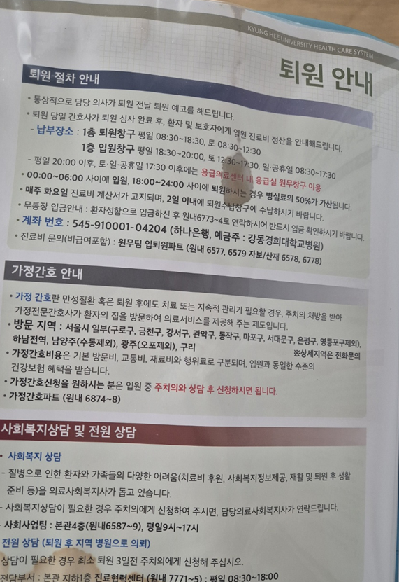 - 본래 2박 3일 입원 후 퇴원하는 것이 FM입니다. 그런데 저는 어차피 이후 전원할 병원을 골라서 넘어갈 계획이었기에 조금 더 입원을 할 수 없는지 문의드려보았고 상태를 쭉 보시더니 1일 추가 입원이 가능하다고 알려주셔서 3박 4일 입원하게 되었습니다.