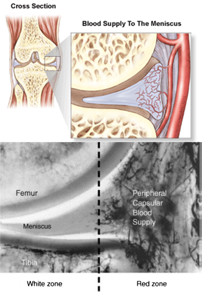 - 연골판은 혈관이 없는 조직입니다. 그러다보니 재생이 쉽지 않은 소모성기관인데, 일부 바깥쪽에는 혈관에 인접하여 피가 흐르는? 맞닿아 영향을 받는? 부위가 있습니다. 이처럼 혈관에 인접하여 봉합시 붙을 가능성이 높은 부분을 레드존이라고 하며 반대로 혈관가 거리가 멀어 재생 가능성이 거의 없는 부분을 화이트존이라고 합니다. 연골판 전체로 보면 레드존이 전체의 1/3, 그 중간 정도 되는 레드화이트존이 1/3, 화이트존이 1/3 정도입니다. 완전히 화이트존이 파열되었을 경우, 봉합을 해도 붙을 가능성이 거의 없기 때문에 절제술이 추천될 확률이 높습니다. 반면 레드존 파열이라면 적극적으로 봉합술을 제안하는 의사분들이 많을 겁니다.
