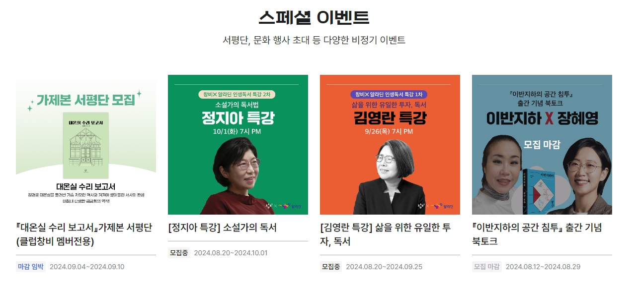 - 클럽 창비 멤버십 회원을 위한 연사 강연으로 기존 안내는 3개가 띄워져 있으나 실제로는 상기 4개를 계획한 듯