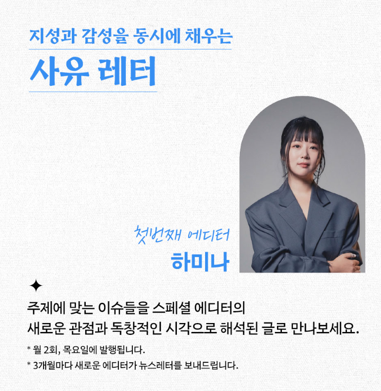- 월 2회 발송되는 뉴스레터로 에디터의 큐레이션 뉴스레터 제공(추천도서, 서평, 이벤트 안내 등 예상)