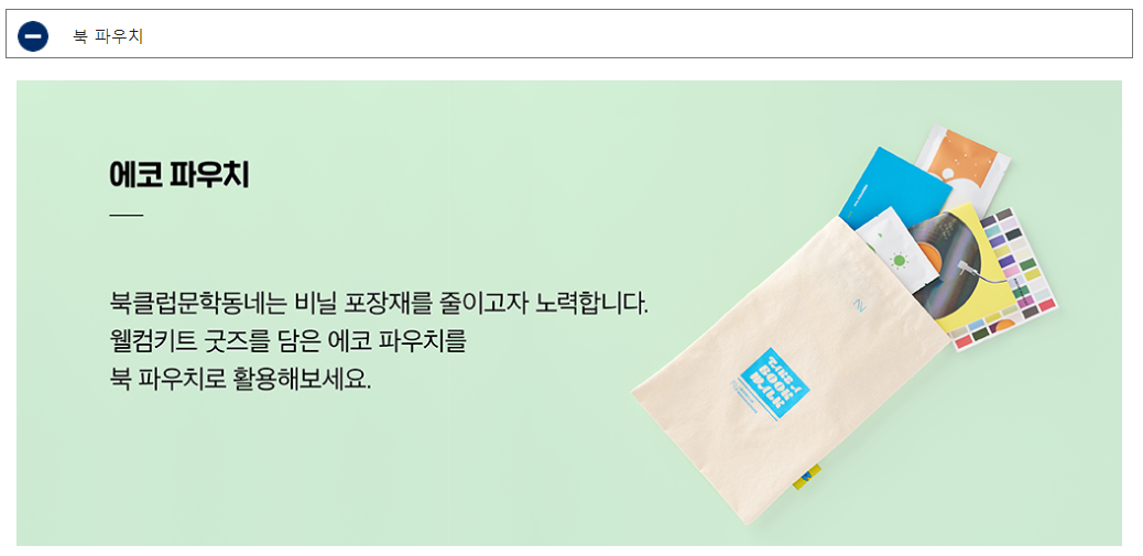 - 포함 내용('22년 기준): 북클럽 에디션 도서 3권, 웰컴 선택 도서 3권, 굿즈(북파우치, 노트패드, 한줄 노트),