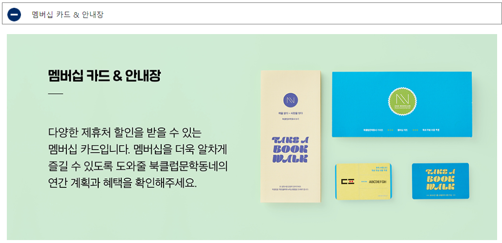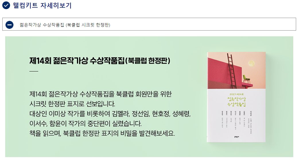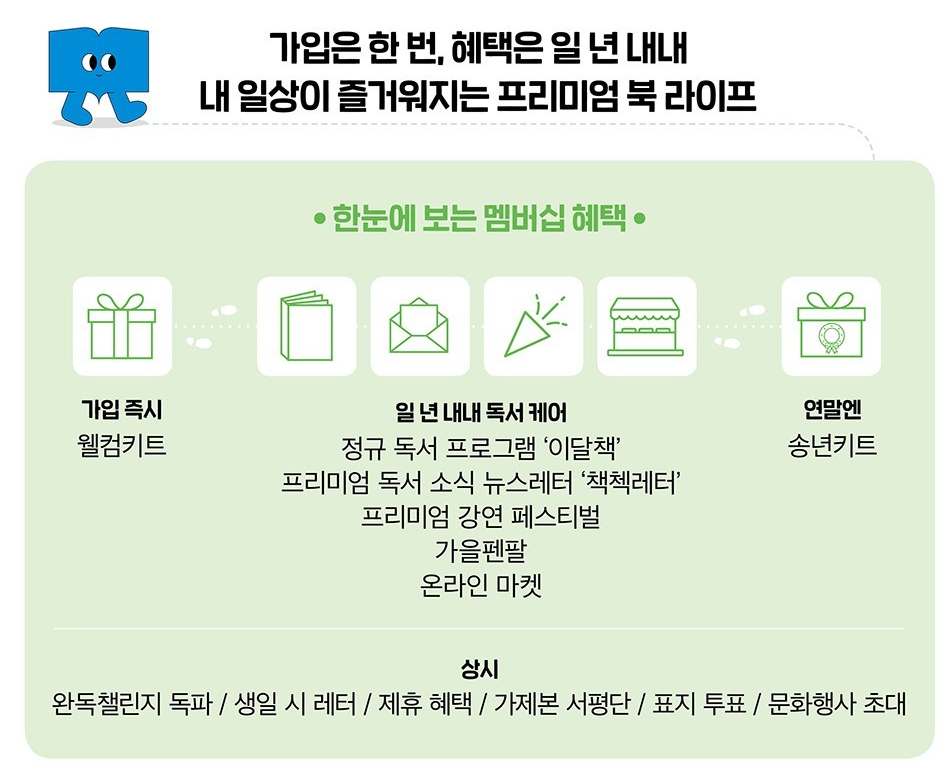 - 포함 내용('22년 기준): 북클럽 에디션 도서 3권, 웰컴 선택 도서 3권, 굿즈(북파우치, 노트패드, 한줄 노트),