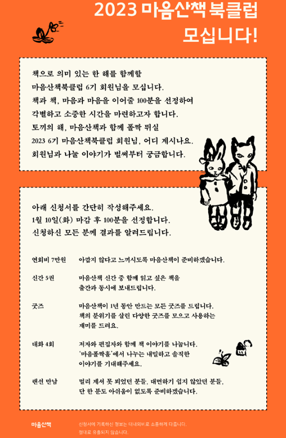 - 포함 내용: 마음산책 신간 5권, 연간 제작 모든 굿즈, 저자/편집자와의 대화 4회, 랜선 만남
