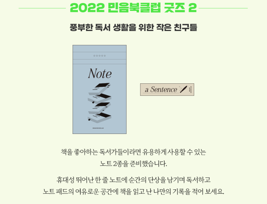 | 굿즈 | 연간 발매 굿즈 전체 | (2022년 기준) 북파우치, 노트패드, 한 줄 노트, 민음북클럽 가이드 |