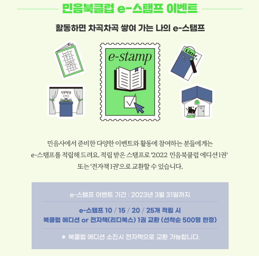 | 기타 서비스 | ? | 민음사 패밀리데이 마켓, e-스탬프 이벤트, 온오프라인 독서모임, 민음북샵 이용 시 포인트 차감 할인 |