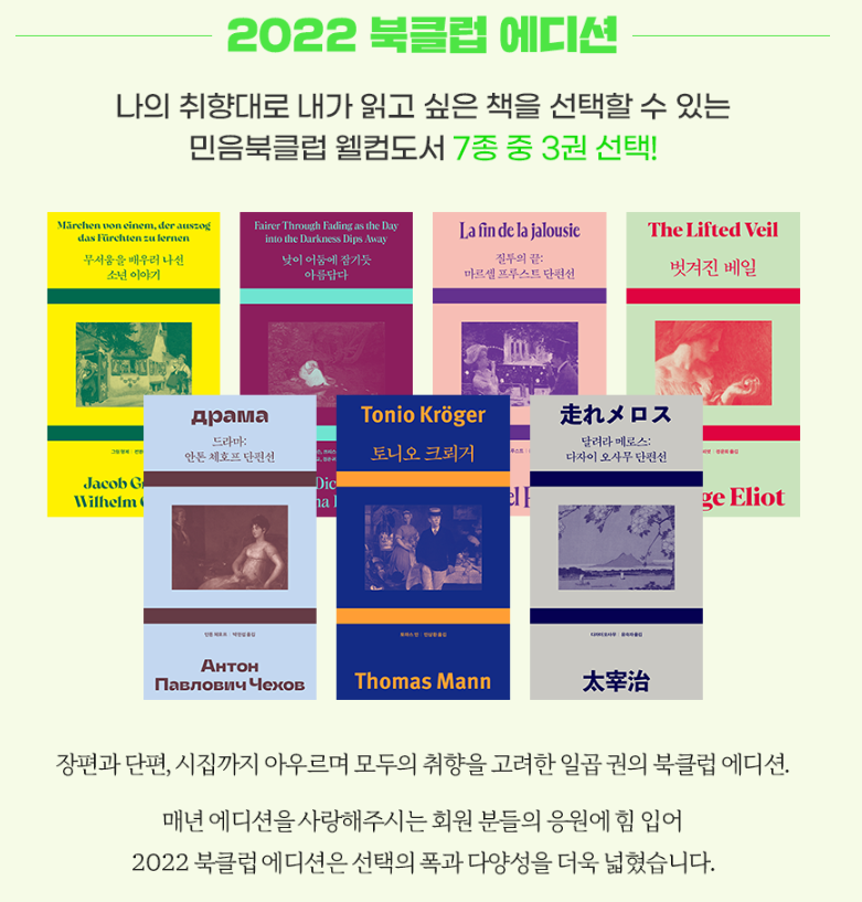 | 제공도서 | 마음산책 신간 5권 | (2022년 기준) 민음사 서적 6권 (세계문학전집/세계시인선/오늘의 젊은 작가 시리즈 중 웰컴도서 3권 + 북클럽 에디션 도서 7종 중 3권) |
