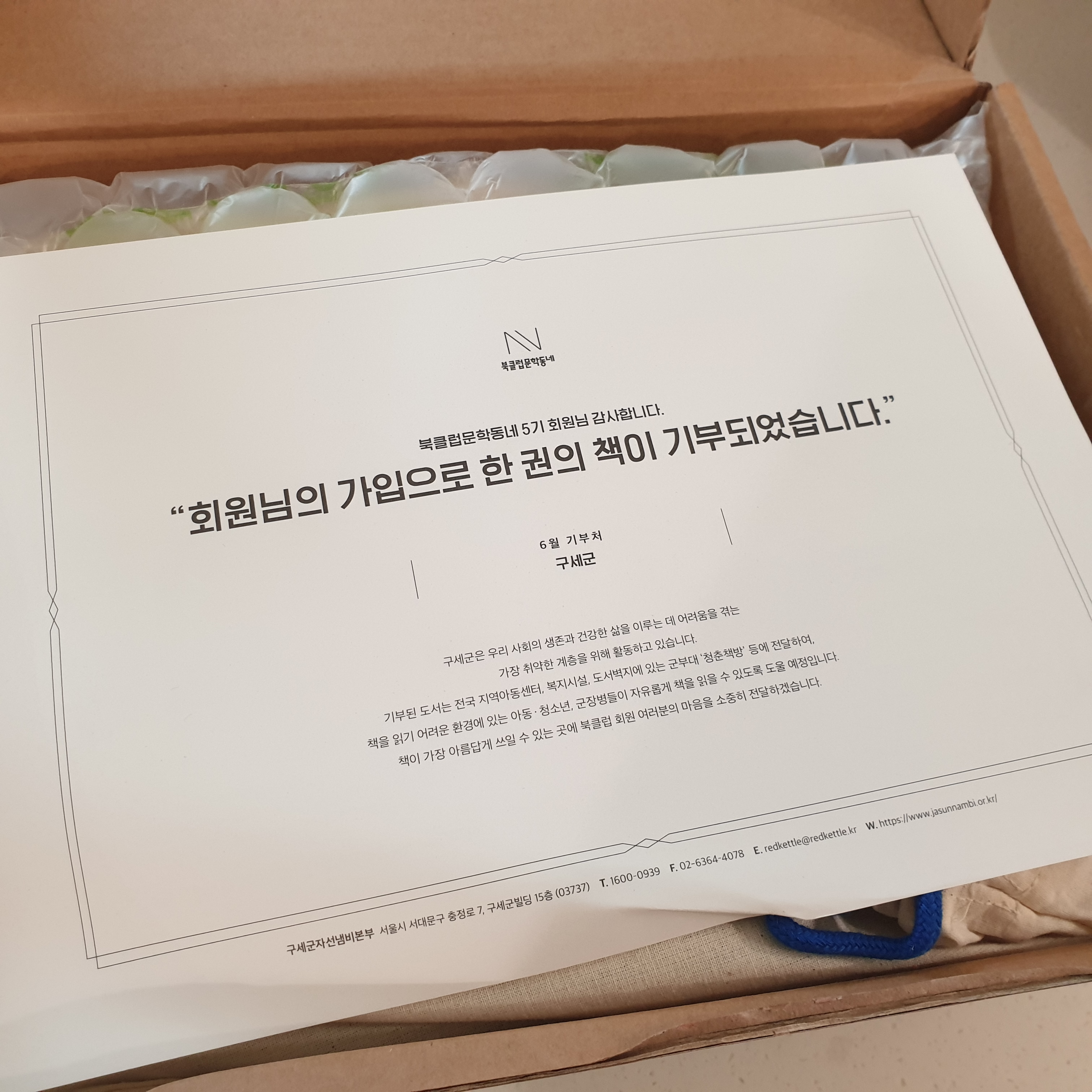 상자를 열면 가장 먼저 확인하실 수 있는 메시지입니다. 북클럽문학동네는 회원가입 1명당 1권의 책을 기부하는 캠페인을 실시하고 있습니다. 저는 6월에 가입을 해서 [6월 기부처 구세군]이라고 쓰여있는 부분을 확인하실 수 있습니다. 매월 기부처가 달라지는 방식으로 진행된 것 같습니다. 메시지가 적힌 종이를 꺼내고 나면 충격 방지를 위한 보호 비닐 아래 에코백이 들어 있고, 그 안에 상세 구성품들이 들어 있었습니다. 에코백에 들어있는 사진을 깜빡 찍지 못했네요 ㅠ