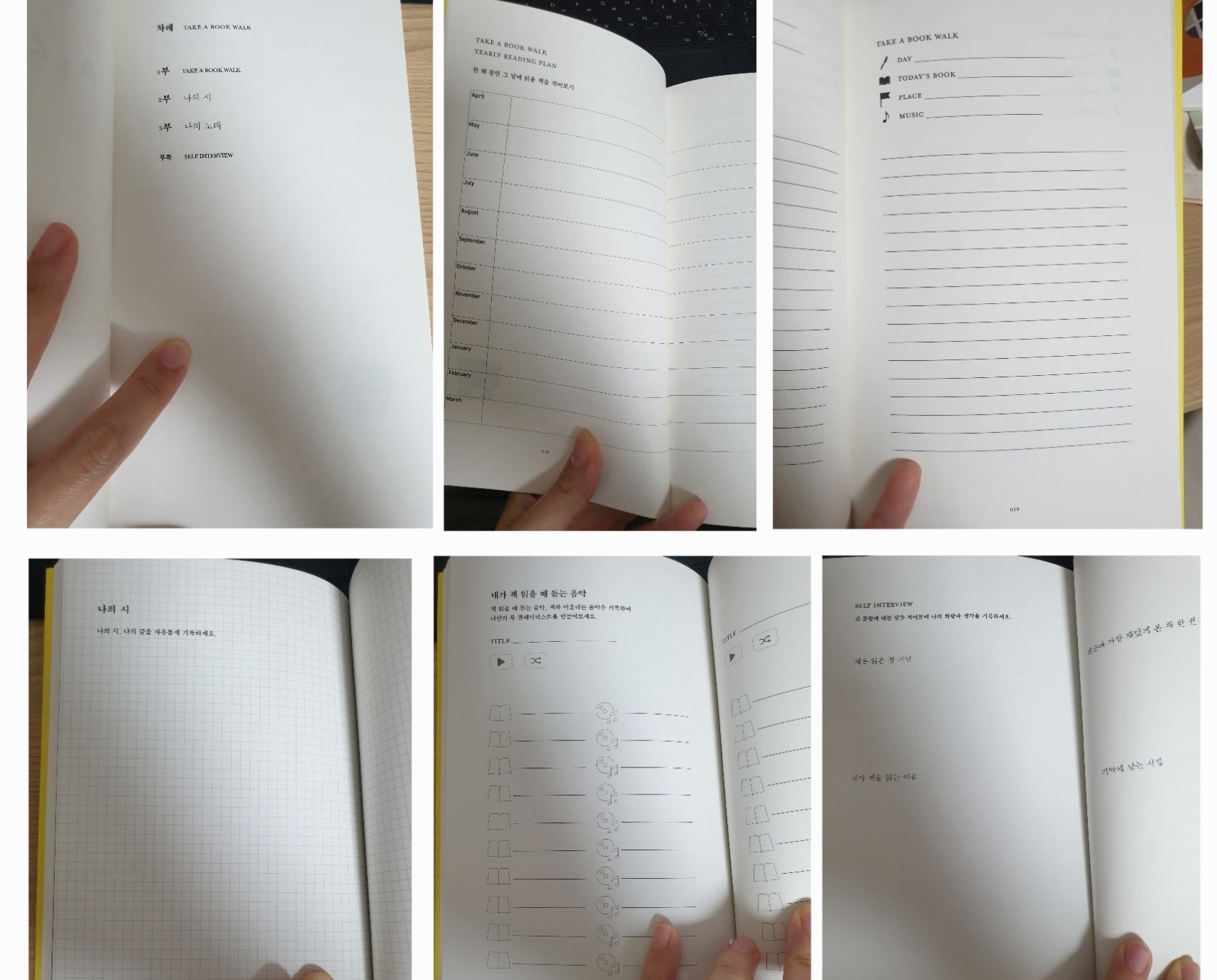 크게 목차 - 월별 독서 계획 - 독서기록장 - 자유노트 - 독서 플레이리스트 적어보기 - 셀프인터뷰 순입니다.