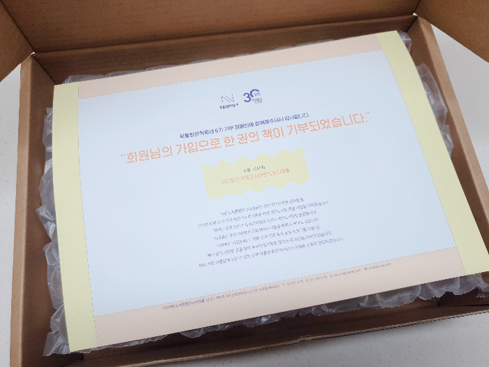 금년도 문학동네북클럽 패키지는 작년의 심플하고 고풍스러운 느낌에서 깜찍하고 발랄한 느낌으로 바뀌었습니다. 올해 테마는 [Take a Book Walk] 인데, 가볍게 산책을 하면서 노래를 듣는 것처럼 독서를 하는 컨셉으로 보여집니다. 이번에도 역시 상자를 열자 마자 북클럽 가입에 따른 기부를 안내하는 메시지가 환영 인사를 건넵니다. 4월의 기부처는 [사단법인 작은도서관만드는사람들] 이네요!