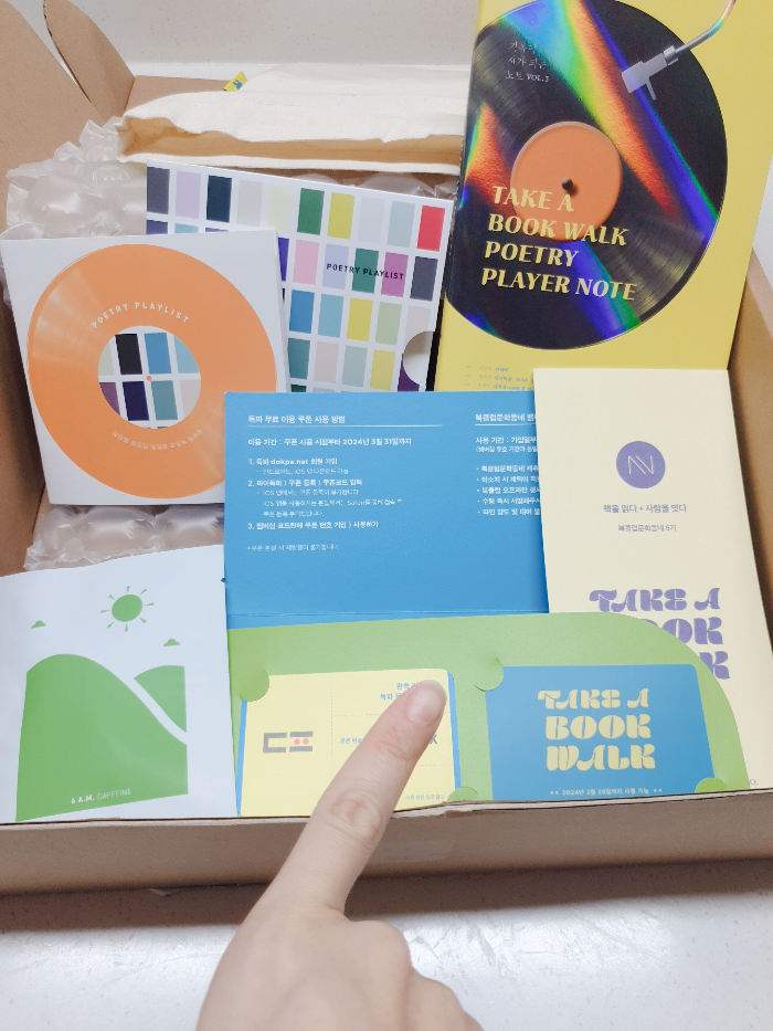 각종 굿즈들을 펼쳐놓은 것입니다. 좌측 상단부터 시계방향으로 살펴 보겠습니다. 주황색의 CD 모양은 [Poetry Playlist]로 옆에 알록달록한 CD 케이스에 꽂혀진 형태로 제작되었습니다. 다섯명의 시인이 고른 다섯개의 시가 소개되어 있는 가벼운 부록입니다. 옆에는 [기록이 시가되는 노트 Vol. 3] 입니다. 이번 북클럽 웰컴키트 컨셉이 '음악을 듣는 것'인지 기록이 시가되는 노트도 LP판 사진이 그려져 있습니다. 안의 구성은 하단에서 다시 살펴보겠습니다. 기록이 시가되는 노트 하단은 북클럽 가이드이며, 파란 카드는 2023년도 북클럽문학동네 멤버십 카드, 노란 쿠폰은 독파 1년 이용권입니다. 그 옆에는 카페 꼼마의 드립 커피가 있습니다.