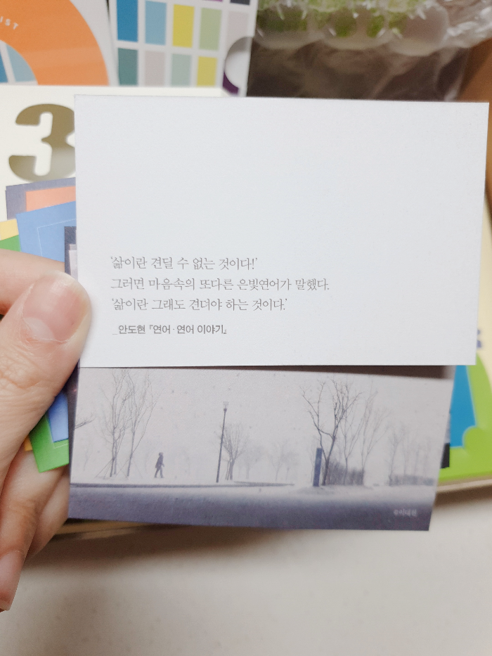 다음은 얼리버드 특전이라던 한국문학전집 문장 30선입니다. 30개의 카드에 한 쪽 면은 일러스트/포토, 반대쪽 면은 한국문학전집 작품 중 일부의 문장들이 수록되어 있습니다. 문학동네 30주년 기념 굿즈라는데 얼리버드 굿즈치고는 조금 아쉬운 것 같네요..ㅠ