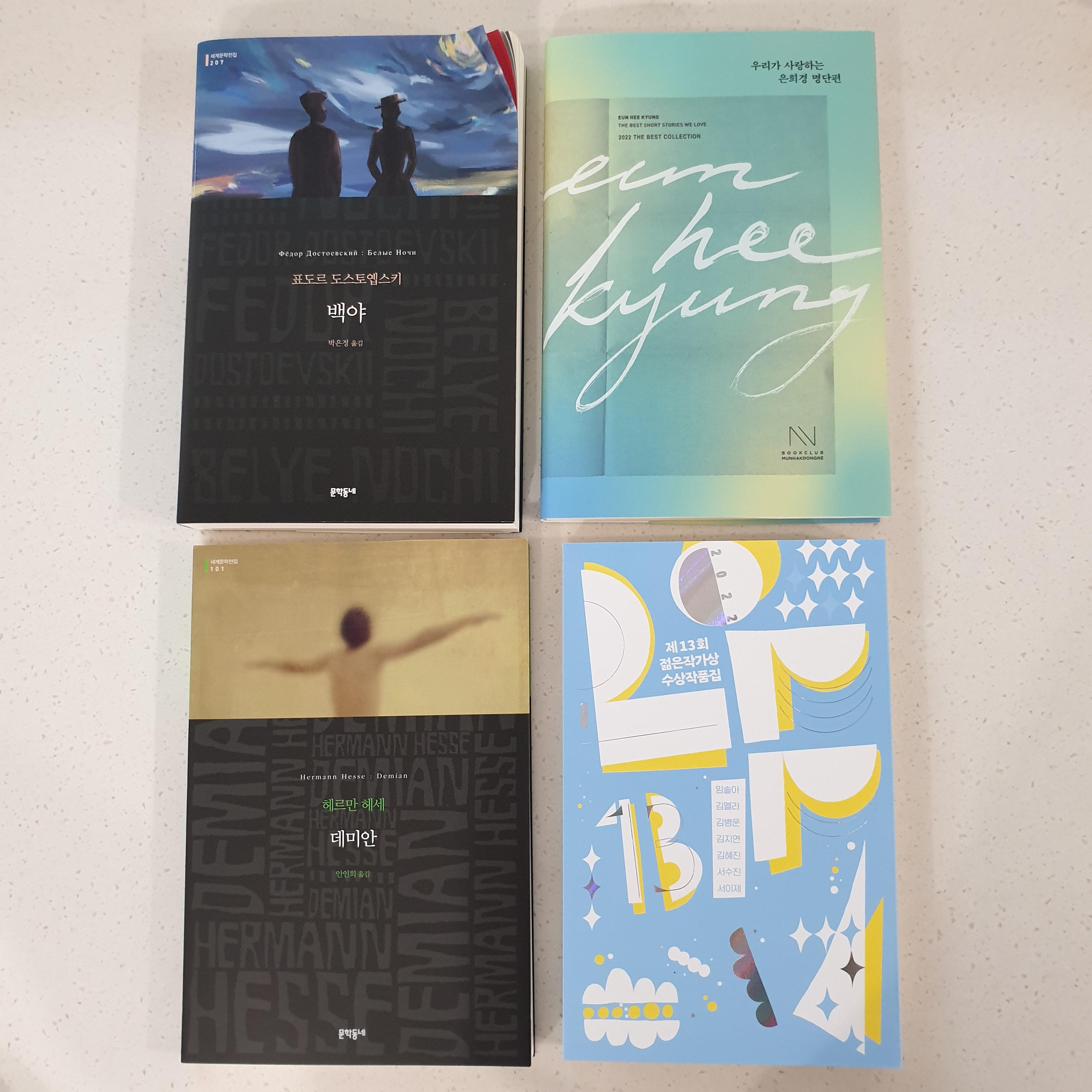 다음은 선택도서 2권과 '우리가 사랑하는 은희경 명단편' 1권, '제 13회 젊은작가상 수상작품집(북클럽 한정 에디션)' 1권입니다. 저는 늦게 신청해서 선택도서가 많이 빠진 상황이었어서, 선택도서를 오히려 스테디 중의 스테디, 베스트셀러 중의 베스트 셀러 쪽으로 골라봤습니다 ㅎㅎㅎ 거의 10년만에 다시 읽어보는 데미안이었는데, 고전 도서는 과연 읽을 때마다 다른 느낌을 주는 것 같습니다. 세계문학전집을 들여놓을까 고민하던 것이 북클럽을 시작하면서 궁금하거나 다시 보고 싶은 책들을 한 권 두 권씩 모아가는 것으로 마음을 바꾸었습니다.