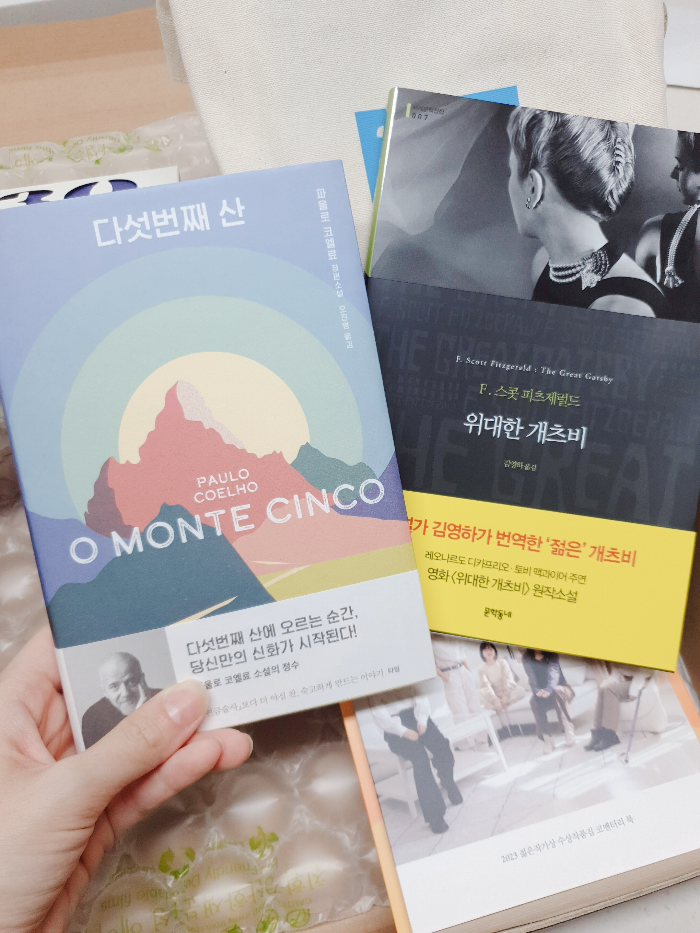 작년보다 작은 사이즈의 에코백입니다. 작년 에코백에는 여러 물품들이 다 들어 있었다면 금년도 에코백 안에는 멤버십 카드 등 일부 굿즈들만이 들어있습니다. 작년과 동일하게 선택도서 2권(저는 위대한개츠비 + 다섯번째산을 선택했습니다)과 웰컴도서 2권(젊은작가상 수상작품집, 소설가들이 뽑은 올해의 소설(작년으로 치면 우리가 사랑하는 은희경 명단편))이 들어 있습니다. 기록이 시가되는 노트, 멤버십 가이드 및 카드, 뭉친 연간 무료 이용권이 동봉된 것도 동일합니다.