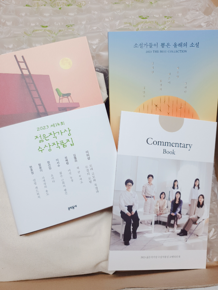 선택도서 2권 + 웰컴도서 2권입니다. 코멘터리북이 추가되었는데 얇은 손바닥크기의 수첩 정도의 사이즈로 젊은작가상을 수상한 7 작가들을 인터뷰한 코멘터리 내용이 들어있습니다. 기존의 젊은작가상 수상작품집 안에도 개별 작품에 대한 작가노트 및 해설과 전체 심사 경위가 포함되어 있었지만 아무래도 작가노트는 수상 작품을 떠나 작가 한 명 한 명에 대해 알아보기에는 아쉬움이 남는다고 생각한 것 같습니다. 2023년도 젊은작가상 수상작품집 안에도 작품+작가노트+해설의 구성은 동일하게 나와 있으며, 코멘터리 북을 통해서는 추가적으로 작품을 쓴 작가와 한걸음 더 가깝게, 친밀하게 다가가며 작품을 이해하는 데 도움을 받을 수 있겠다는 정도로 이해하시면 좋겠습니다.