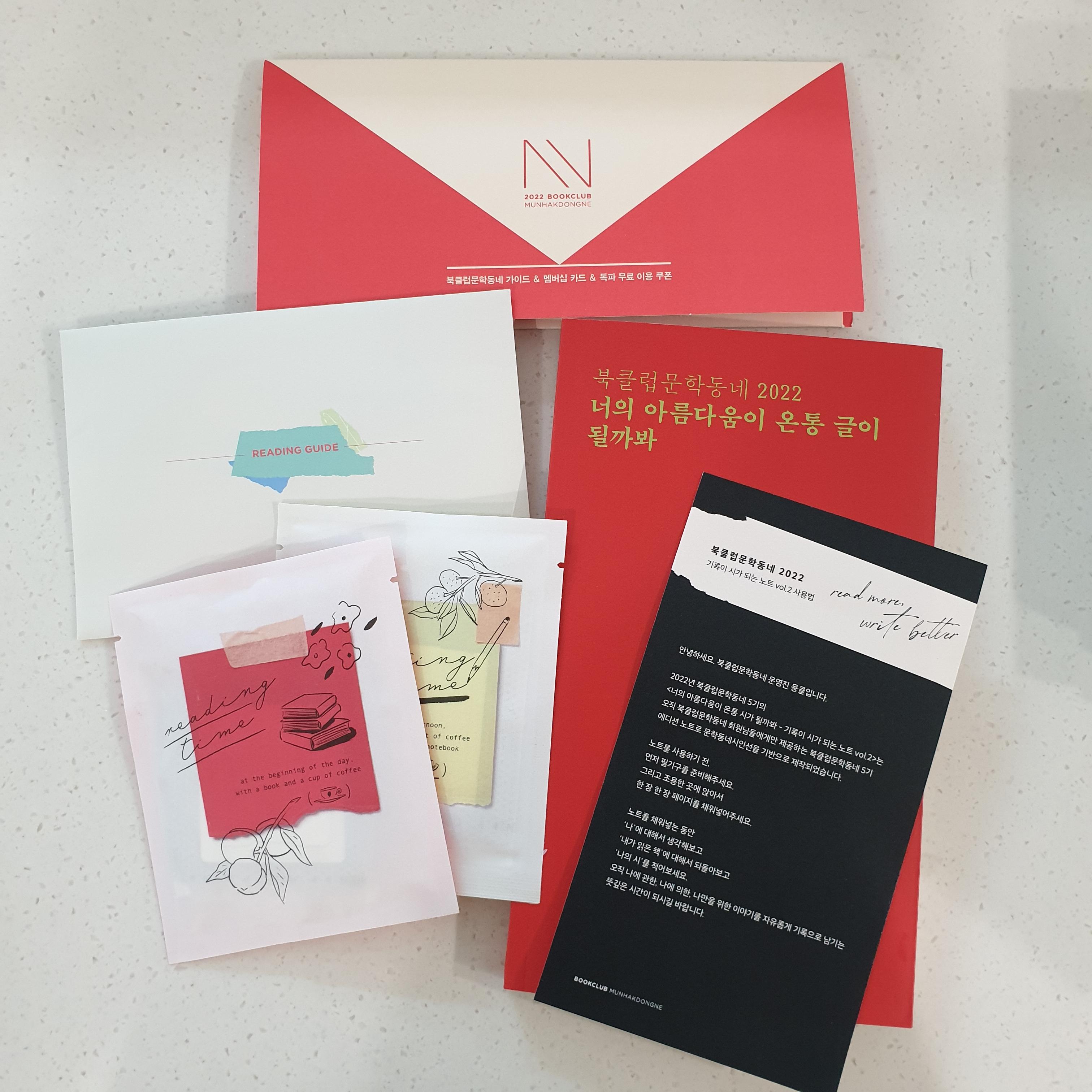 다음은 그 밖의 구성품들입니다. 카페 꼼마의 드립 커피! 저는 이게 상당히 마음에 들었습니다:) [Reading Time]과 [Writing Time]의 구성이 재미있고 커피 맛도 좋았습니다. 제휴 서비스 중에 카페 꼼마 할인 내용이 포함되어 있기도 하죠 ㅎㅎㅎ 북클럽문학동네를 이용하는 방법 안내서와 독파 무료 이용 쿠폰, 일종의 굿즈인 [기록이 시가 되는 노트], 멤버십카드, 노트를 꾸밀 수 있는 [스티커]가 들어있습니다. 굿즈는 거의 소장용으로만 보관하는 편이라 급히 안의 내용을 펼쳐 보았습니다.